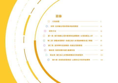 目錄 行政摘要 2 背景:全球醫生短缺現象與香港現狀 14 研究方法 40 第一章:提升機構之間的管理和協調機制,以增加醫生人手 42 第二章:調整實習要求,為醫生進入本港醫療體系減少障礙 66 第三章:提供專科培訓機會,助醫生發展事業 90 第四章:助資深專科醫生盡展所長 108 第五章:優化加入本港醫療體系的申請程序 136 第六章:改良執業資格試,以秉持公平的評核標準 148