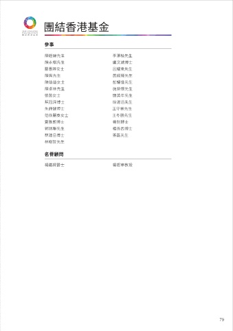 團結香港基金 參事 陳經緯先生 李澤楷先生 陳永棋先生 盧文端博士 曹惠婷女士 呂耀東先生 陳爽先生 黃經輝先生 陳慧慧女士 彭耀佳先生 陳卓林先生 施榮懷先生 張茵女士 唐英年先生 蔡冠深博士 徐湛滔先生 朱鼎健博士 王守業先生 范徐麗泰女士 王冬勝先生 夏雅朗博士 楊釗博士 郭炳聯先生 楊孫西博士 林建岳博士 張磊先生 林樹哲先生 名譽顧問 楊鐵樑爵士 楊振寧教授 79