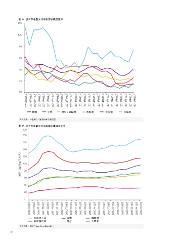 圖 14. 按子市場劃分的甲級寫字樓空置率 整體 中環 灣仔 / 銅鑼灣 港島東 尖沙咀 九龍東 資料來源: 仲量聯行《香港物業市場綜述》。 圖 15. 按子市場劃分的甲級寫字樓租金水平 中環核心區 金鐘 銅鑼灣 中環傳統區 灣仔 九龍東 資料來源: 箂坊 "Hong Kong Monthly"。 64