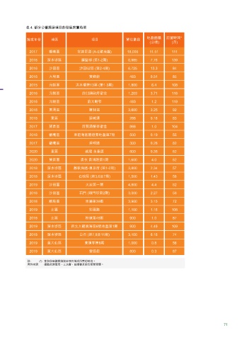 表 4. 部分公營房屋項目的發展前置時間 註: (*) 意指從區議會諮詢至項目落成所需的時間。 資料來源: 運輸及房屋局、立法會、區議會及綜合新聞報導。 71