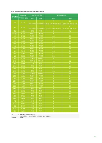 表11: 啟德新發展區經修改發展密度的選定土地例子 註: ( * ) 實際地盤面積取決於詳細調查。 C表示「商業」;R表示「住宅」;CDA則為「綜合發展區」。 資料來源: 規劃署。 93